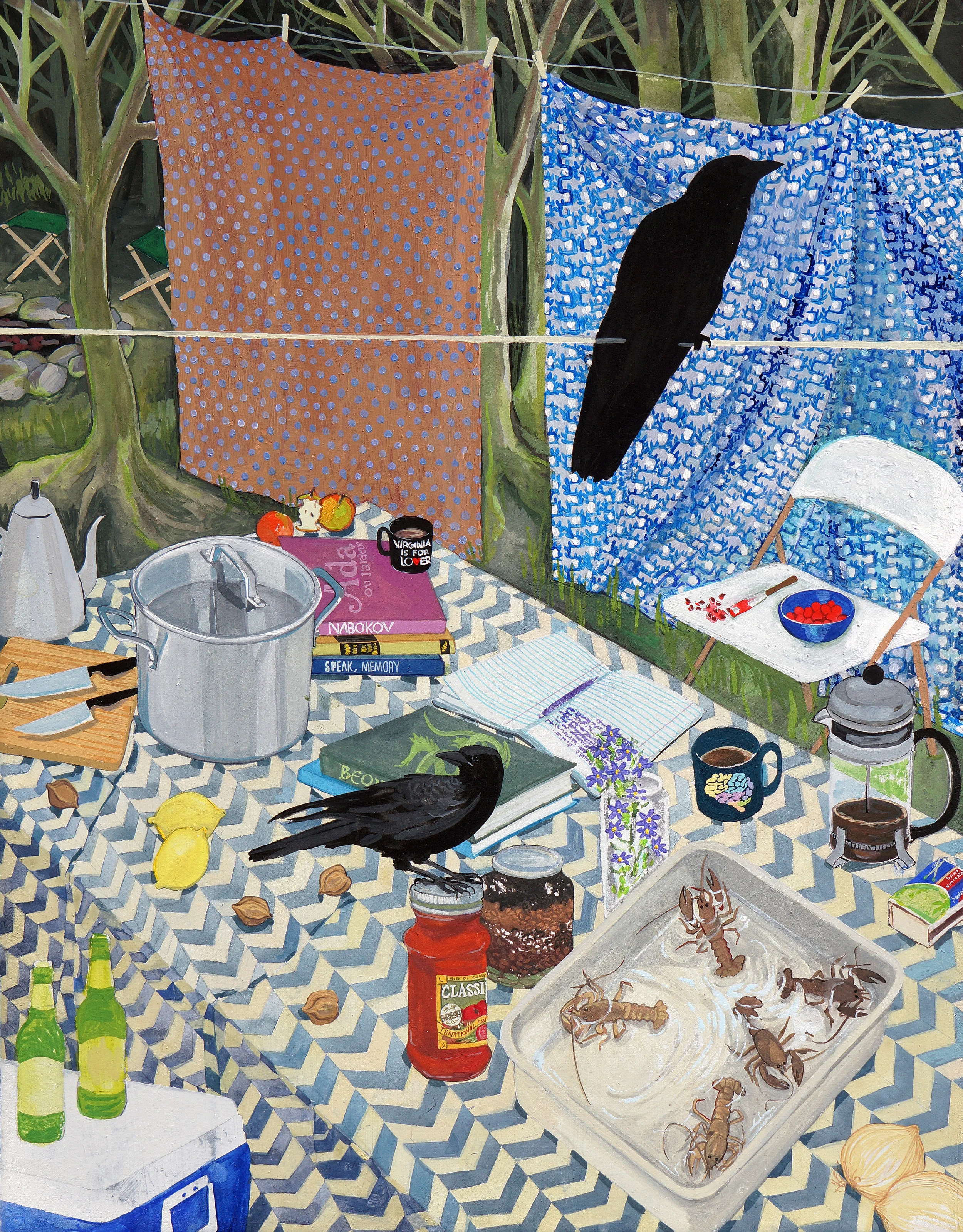 Still Life with Two Crows, gouache and acrylic on panel, 9x12 in.